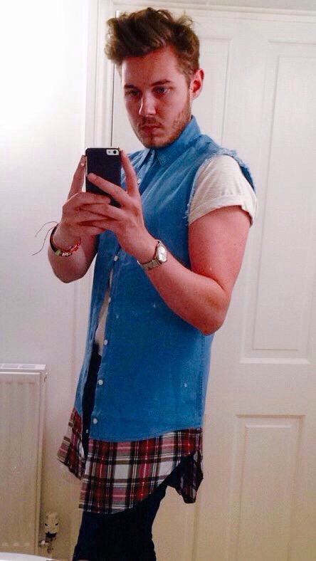 Wearing my new ‘Sleeveless Super Longline Shirt with Tartan Check Hem and Mid Wash’ £12.00.