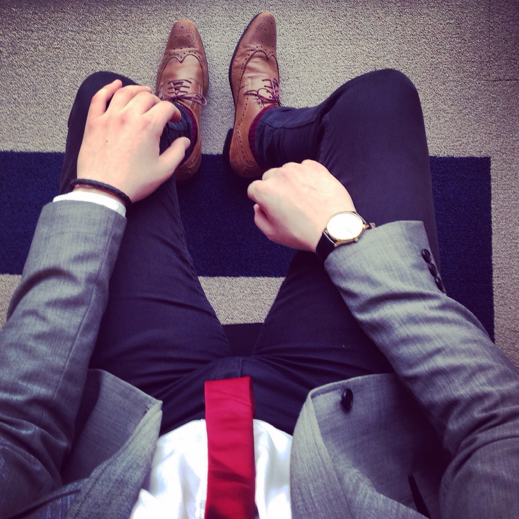 As I’ve gone for black, white and grey, it really didn’t limit me to tie style, colour or material – I’ve therefore gone for a bold red silk tie to bring the outfit to life. This tie was £2.00 from Primark. Whilst we’re on accessories, I’ve worn my red smart socks courtesy of The London Sock Co. to tie the outfit together. They really set off the tan brogues from Burton Menswear (these I got free when i purchased a three piece suit for £99.00).